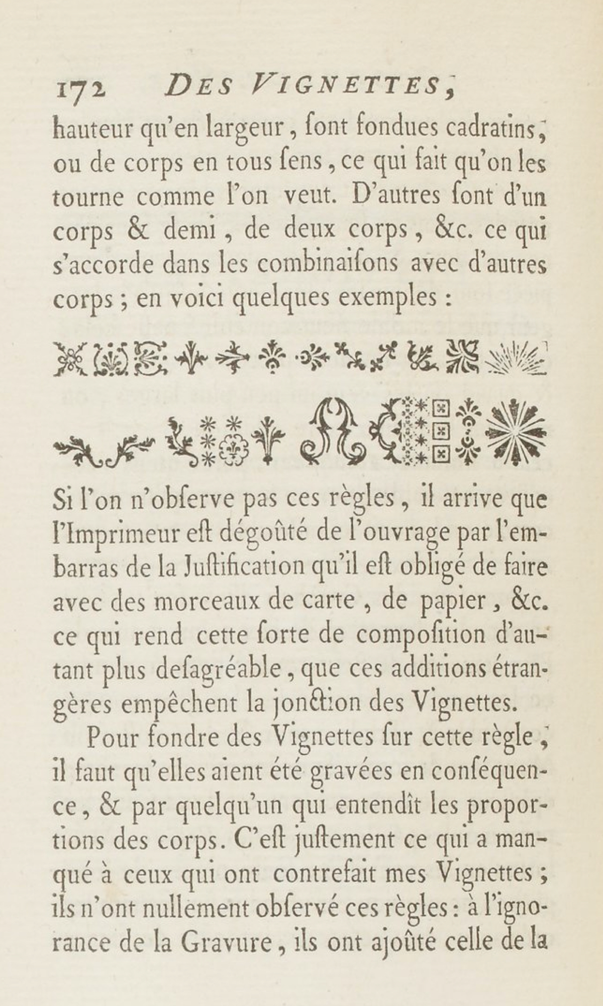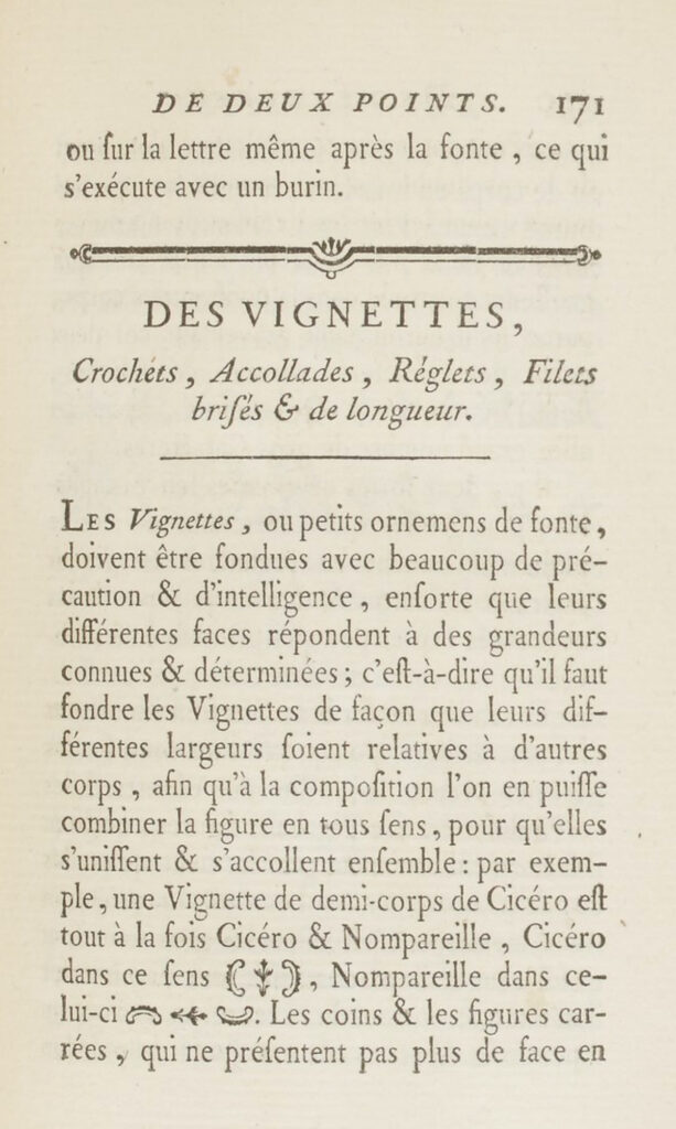 en vastgestelde groottes; dat wil zeggen dat de vignettes zo gegoten moeten worden dat de verschillende formaten overeenkomen met de andere corpsen, zodat de compositie die men er op allerlei wijzen mee kan samenstellen, met elkaar een eenheid vormen: bijvoorbeeld, een vignette van een halve corpsgrootte van Cicéro is tegelijkertijd Cicéro & Nompareille, Cicéro staand en Nompareille liggend.