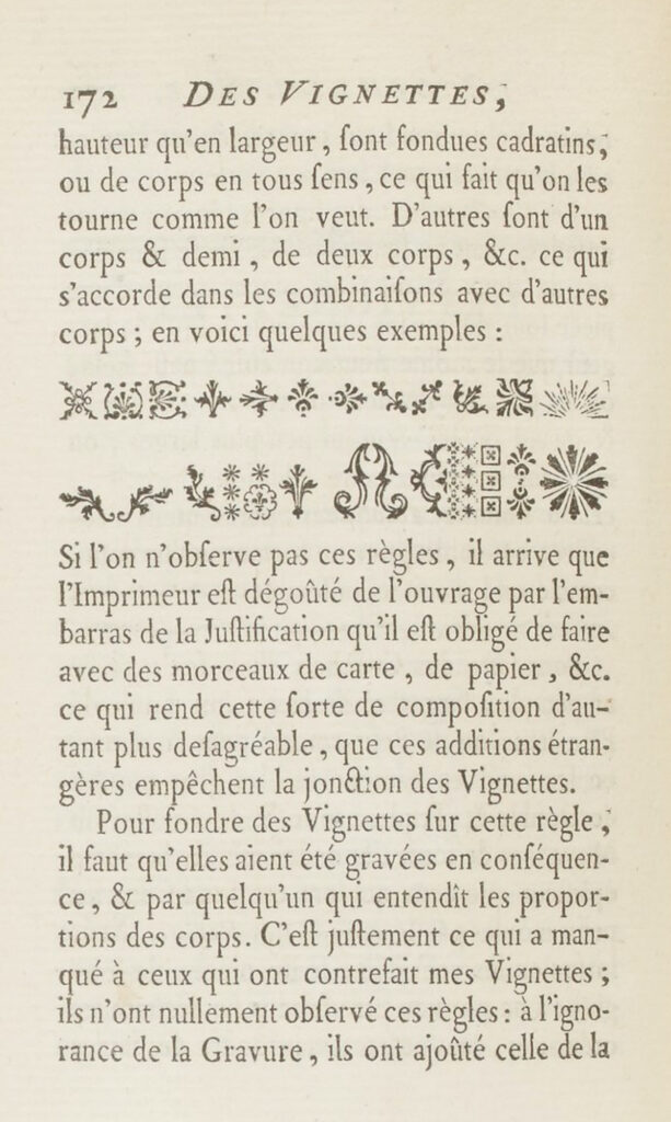 Om vignettes op deze wijze te gieten, moeten ze ook op deze wijze gesneden zijn, & door iemand die de verhoudingen van de corpsen begrijpt. Dat is nou juist wat ontbrak bij diegenen die mijn vignettes hebben nagemaakt; zij hebben deze regels totaal niet gevolgd: door het graveren niet te kennen, hebben ze zich met lettergieten beziggehouden, wat deze nabootsingen nutteloos maakt voor de drukker en ook niet interessant.