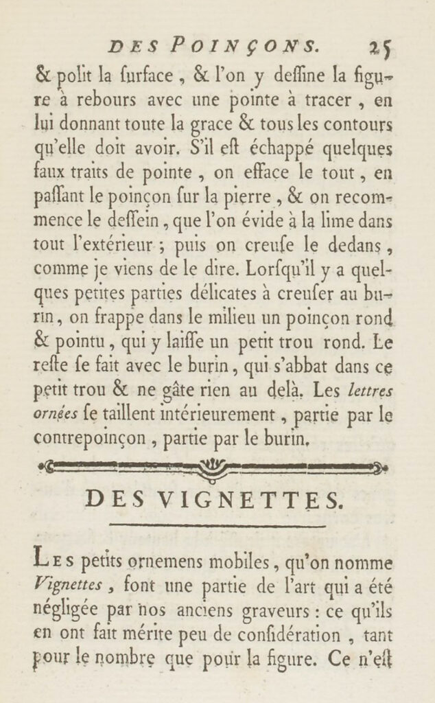 Op het staal dat op de hoogte en grootte is gemaakt voor de bedoelde vignette & glad gemaakt op een steen, tekent men, met de graveernaald, de tekening zoals bedacht; maar, voor deze tekening & het gereedmaken, heb je smaak & vaardigheid nodig, & dat kan je niet in de theorie leren.