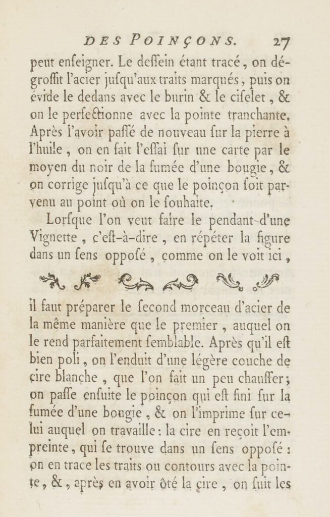 Als men de tegenhanger van de vignette wil maken, dat wil zeggen de vorm gespiegeld herhalen, zoals hier te zien is, moet het tweede stukje staal op dezelfde manier worden voorbewerkt als de eerste, zodat de gelijkenis zo goed mogelijk wordt. Als deze goed glad gemaakt is, dun insmeren met witte was, dat een beetje verwarmd wordt; dan de stempel die al klaar is in de rook van een kaars houden, en deze drukken op de nieuwe stempel: de afdruk komt in de was, in spiegelbeeld: de controuren traceren met de graveernaald, en, nadat de was is verwijderd, de lijnen die de pointe heeft gemaakt, volgen, zoals dat bij de eerste is gedaan; op deze wijze is zeker dat dezelde vorm in tegengestelde richting is herhaald.