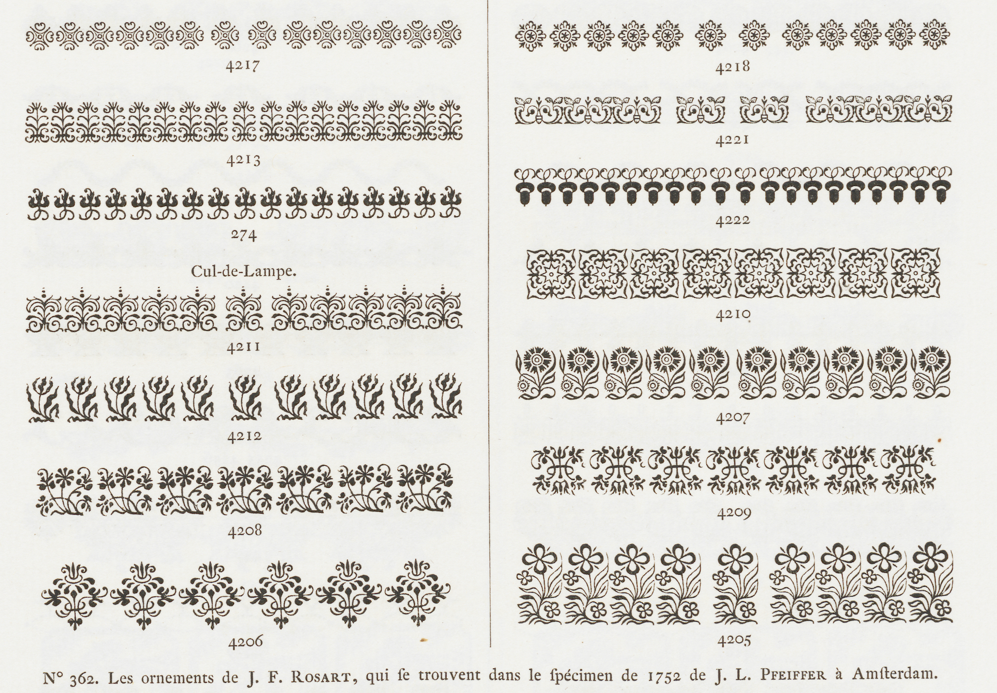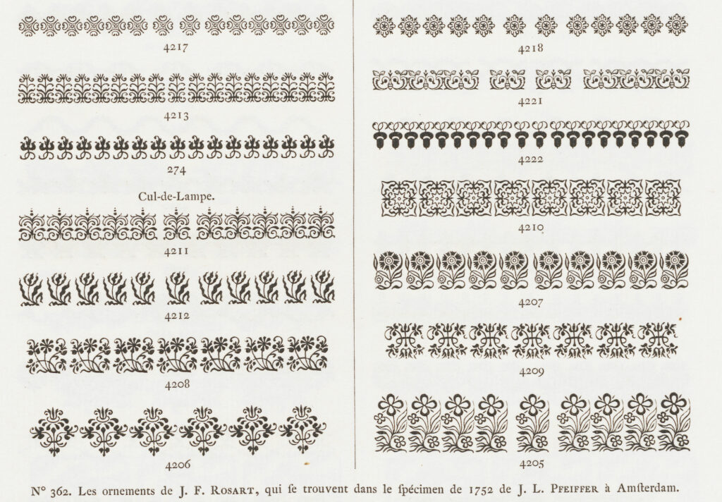 Van lettertypen is bijna altijd bekend wie deze heeft ontworpen/gesneden. Voor ornamenten geldt dat niet.
