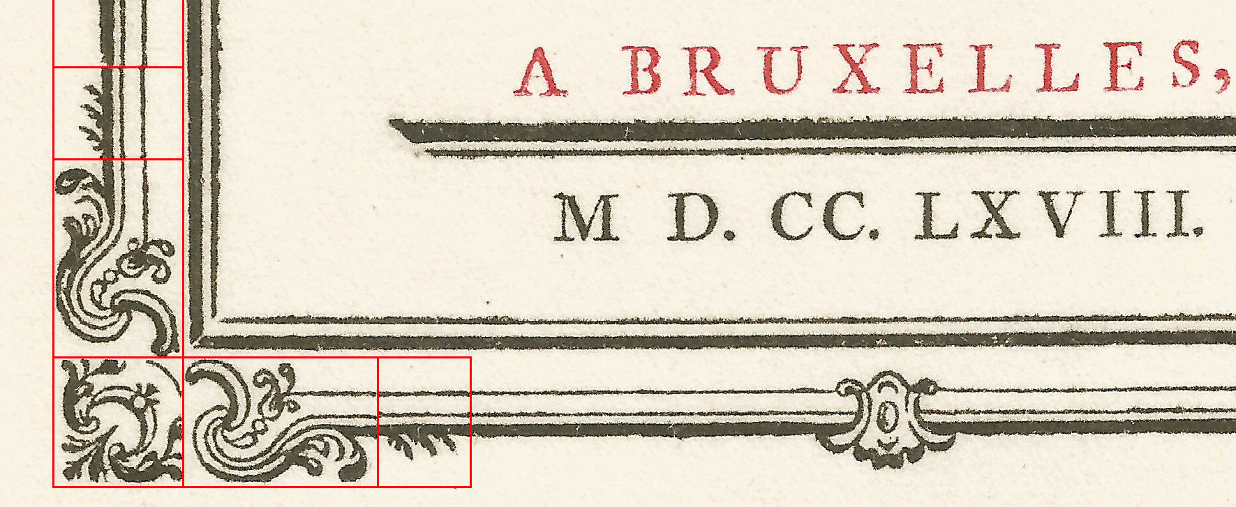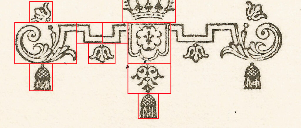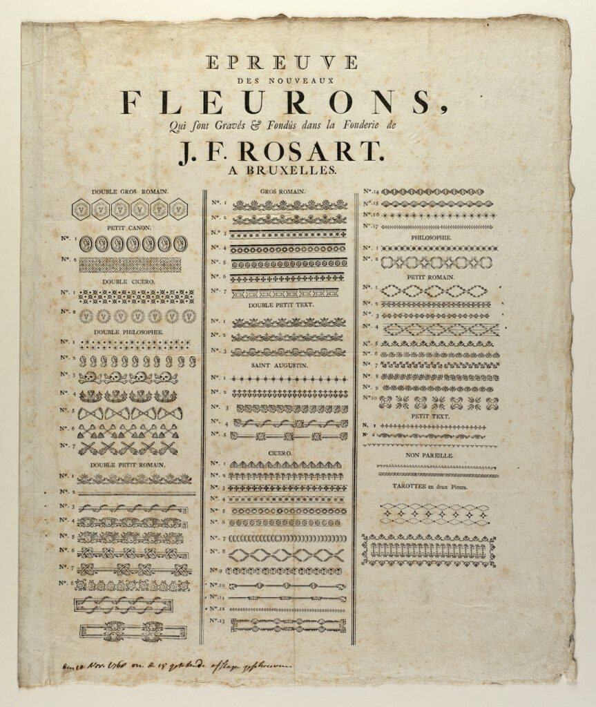 Het maken van een revival begint met het verzamelen van de originele letterproeven van de ornamenten. Deze letterproef uit 1764is vrij goed bewaard gebleven. Het drukken en de papierkwaliteit was in de 18e eeuw echter nog niet optimaal. Wel is dit historische materiaal nodig als referentie bij het beoordeling van de gedigitaliseerde ornamenten.
