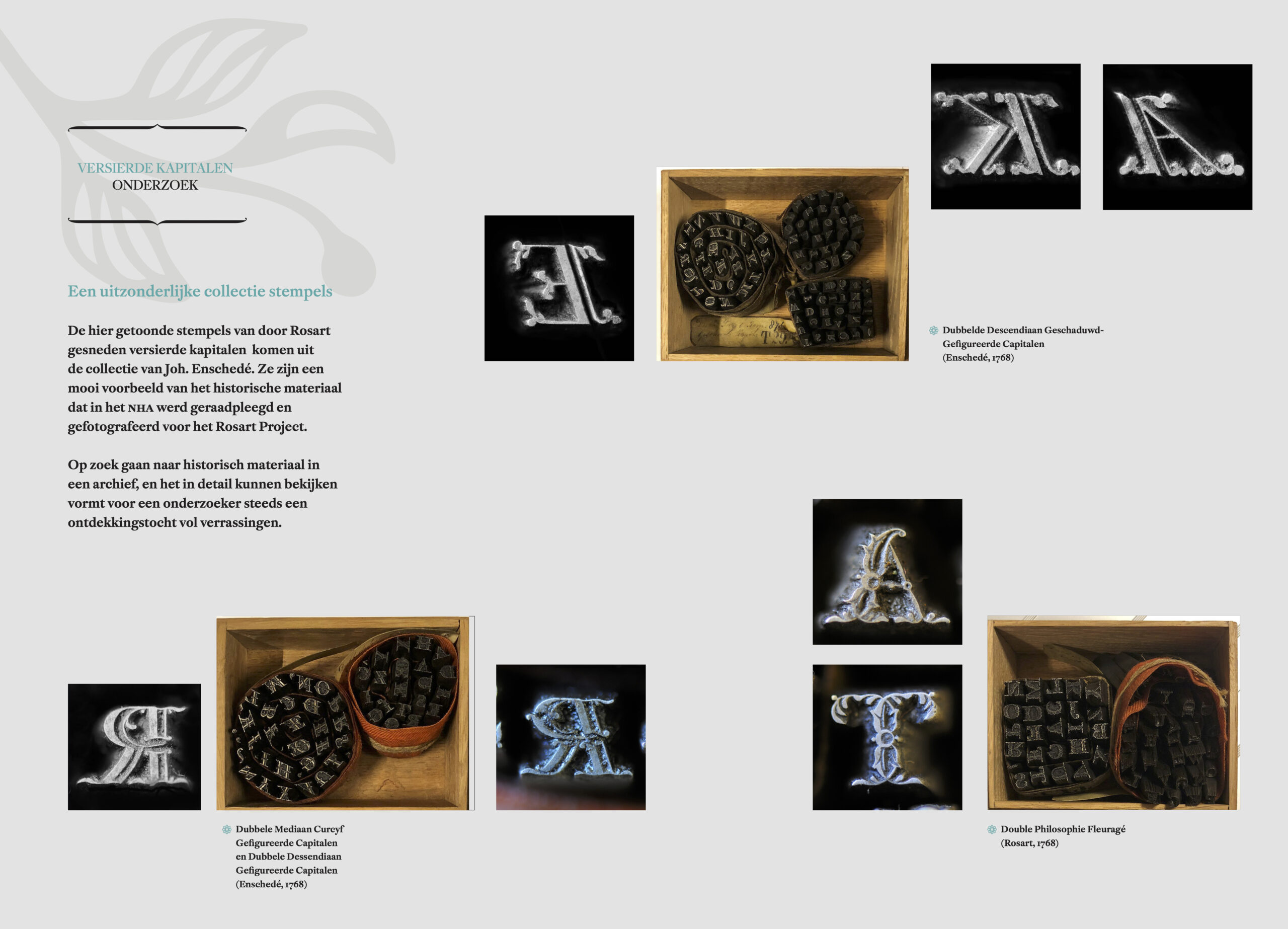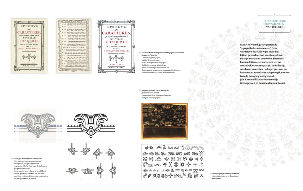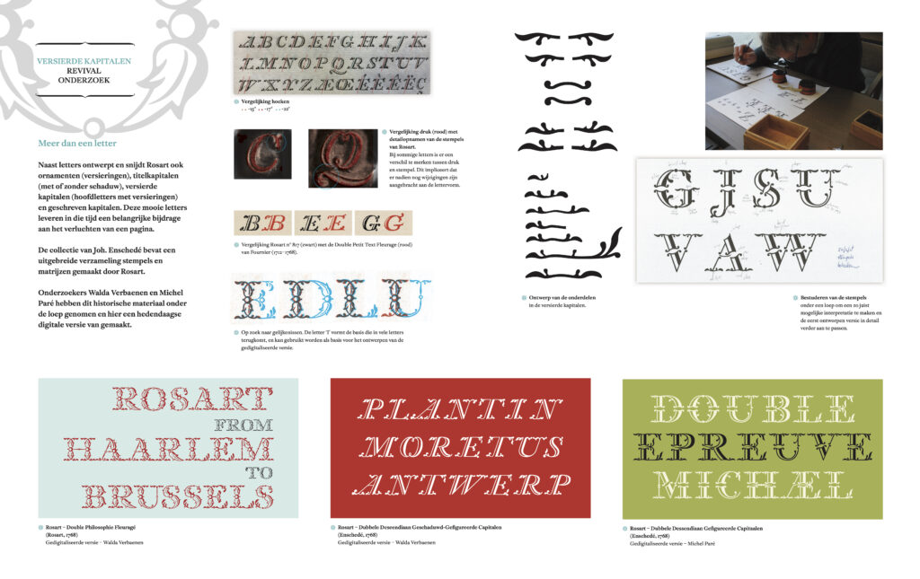 Het onderzoek is daarna voortgezet door het bestuderen van het werk van Rosart in de uitgebreide verzameling van de stempels, matrijzen, letterproeven en documenten in de collecties van enerzijds Joh. Enschedé in het Noord-Hollands Archief (NHA) te Haarlem en het Museum Plantin-Moretus te Antwerpen.
