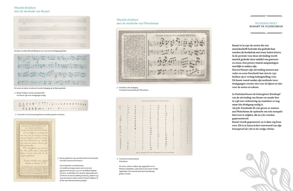 Paneel over het ontwerpen van het muziekschrift. Rosart was degene die al eerste hiervoor een methode bedacht. Joh. Enschede liet Fleischman een versie snijden.