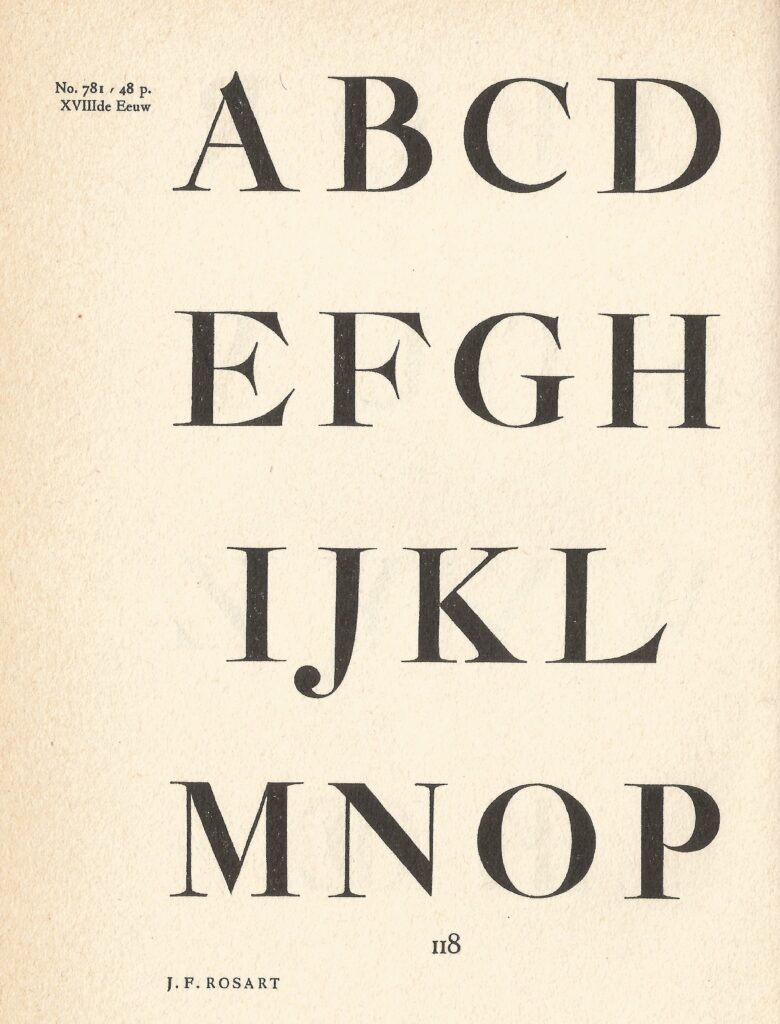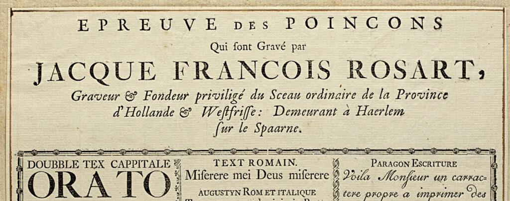 “Letterproef van stempels gesneden door Jacque Francois Rosart, stempelsnijder en lettergieter met privilegezegel van de Provincie Holland en Westfriesland: wonend in Haarlem op het Spaarne.”